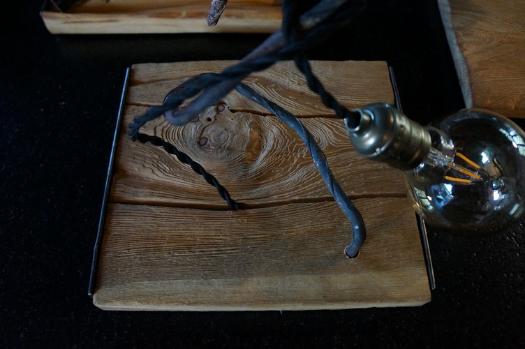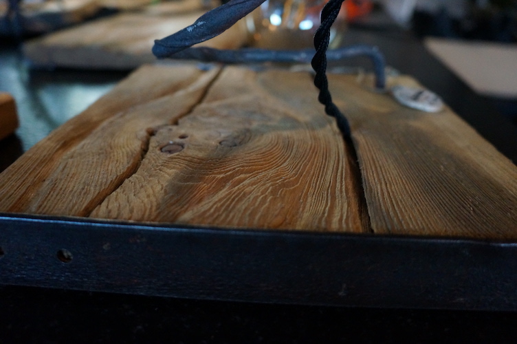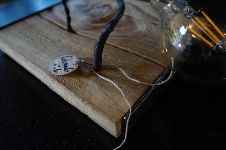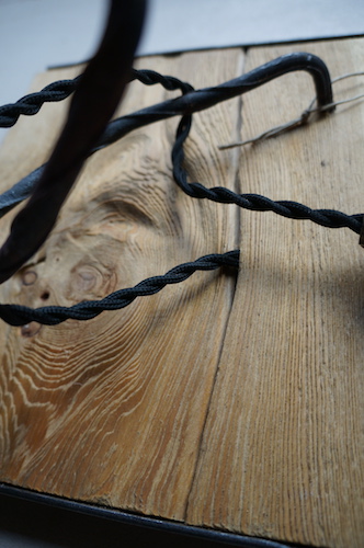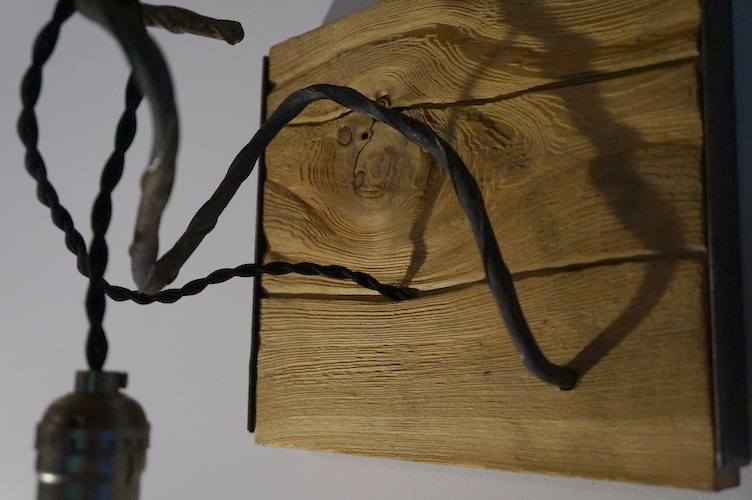 Applique COLORADO N°10. Applique en mélèze et cornières acier vieilli, douille portée par tige filtée vieillie, alimentation par gaine coton vintage.