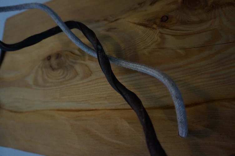 Applique COLORADO N°5. Applique en mélèze et cornières acier vieilli, douille portée par tige filtée vieillie, alimentation par gaine coton vintage.