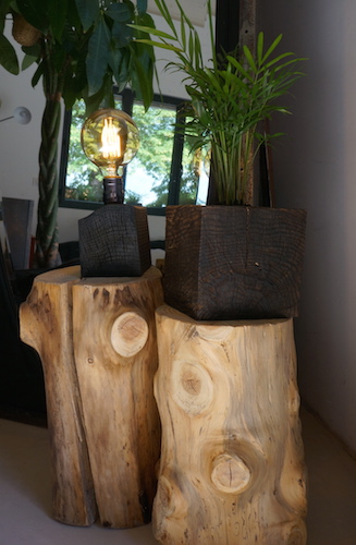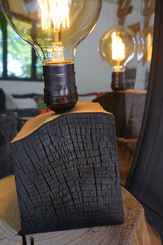Lampe cube FRÊNE. Lampe à poser, cube en frêne massif traité « bois brûlé », alimentation par gaine coton vintage.