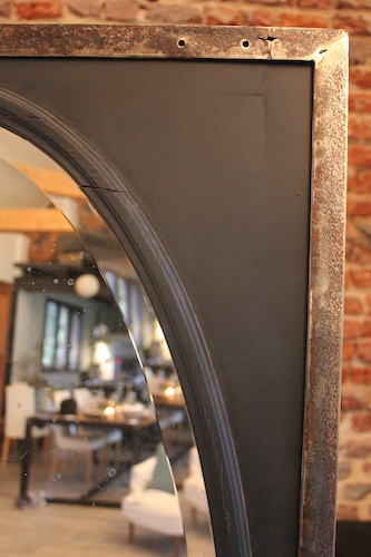 peinte en noire et cerclée d'une cornière métallique vieillie.
