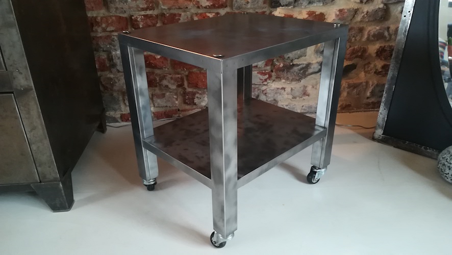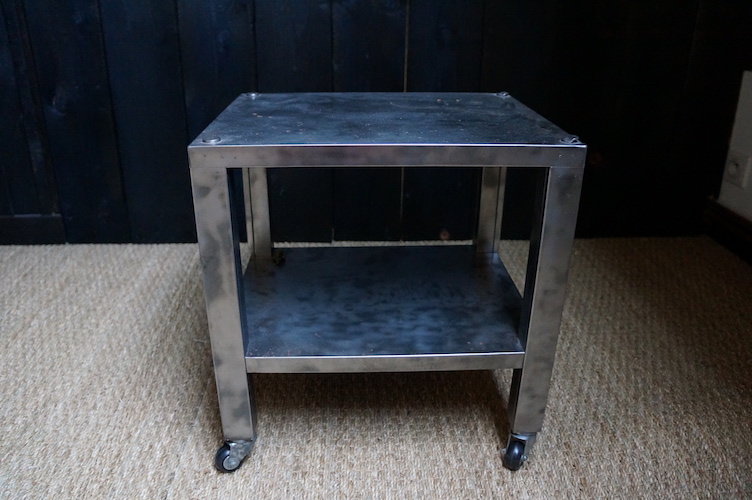 Desserte OPALE. Petite table d'appoint en métal sur roulettes, traitée à la cire « Canon de fusil ».