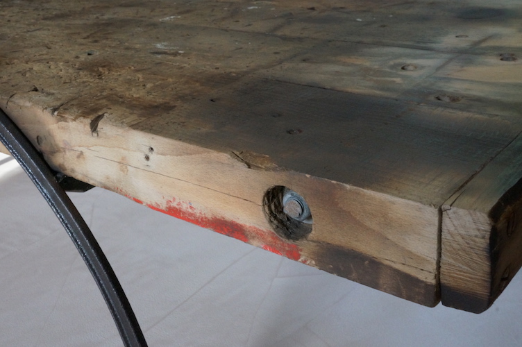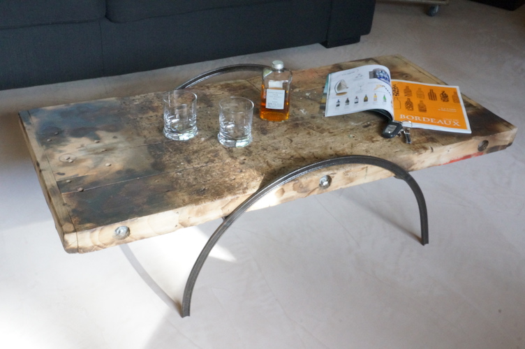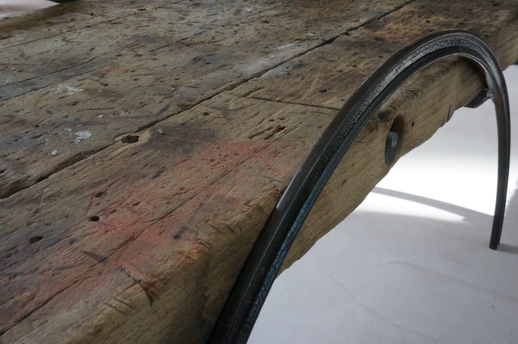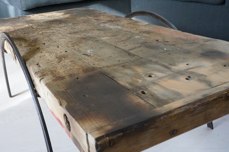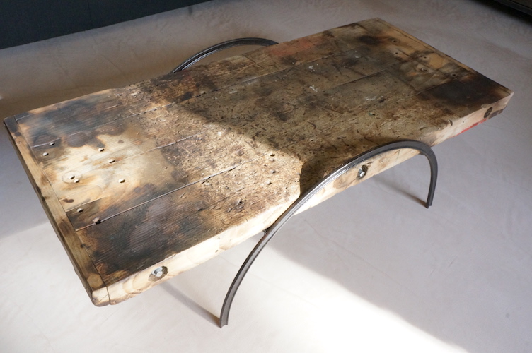 Table basse OSCAR. Ancien plateau d'établi en hêtre massif. Piètement réalisé avec les griffes du rateau fâneur de mon grand-père.