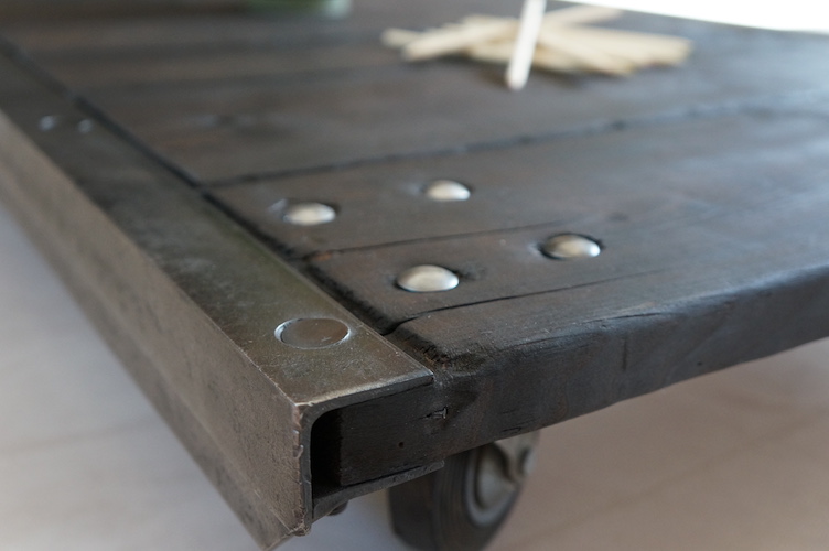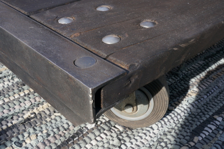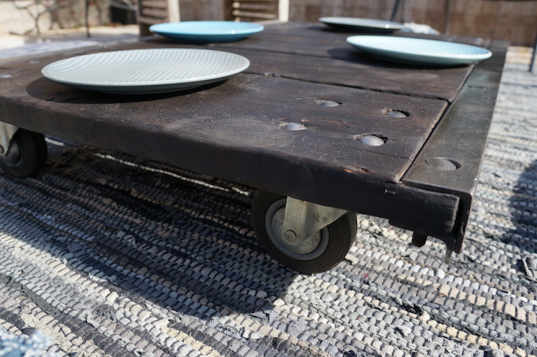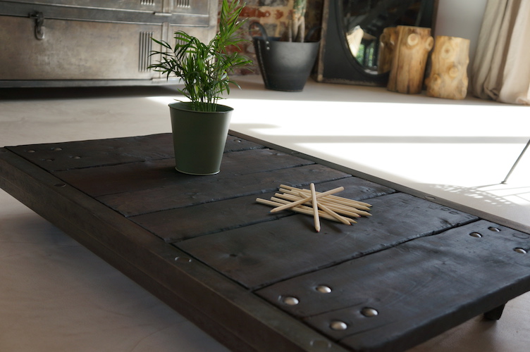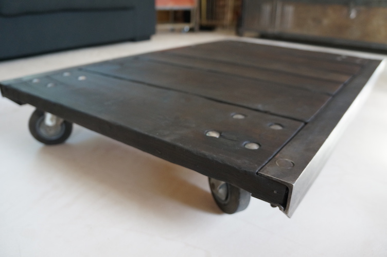 Table basse RUBEN. Palette de transport industriel sur roulettes acier. Plateau massif en bois brûlé, patiné et traité à l'huile de lin.